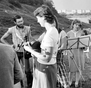Вот фотография тех лет. Репетиция Театра старинной музыки на берегу Москвы-реки, в Коломенском, 1985 год. Скрипач Андрей Звонников (крайний слева), виолончелист Сергей Крапивин, альтистка Анна Соболь (вторая справа), кларнетист Николай Денисов (крайний справа):